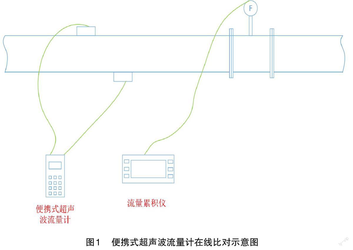 實際工作中,多為用經過檢定合格的便攜式超聲波流量計(標準表)與現(xiàn)場流量計進行串聯(lián),記錄標準表和現(xiàn)場流量計的瞬時流量、累計流量,從而進行在線比對校準,具體見圖1。常見介質為生產水、生活水、循環(huán)水、污水、壓縮空氣等。